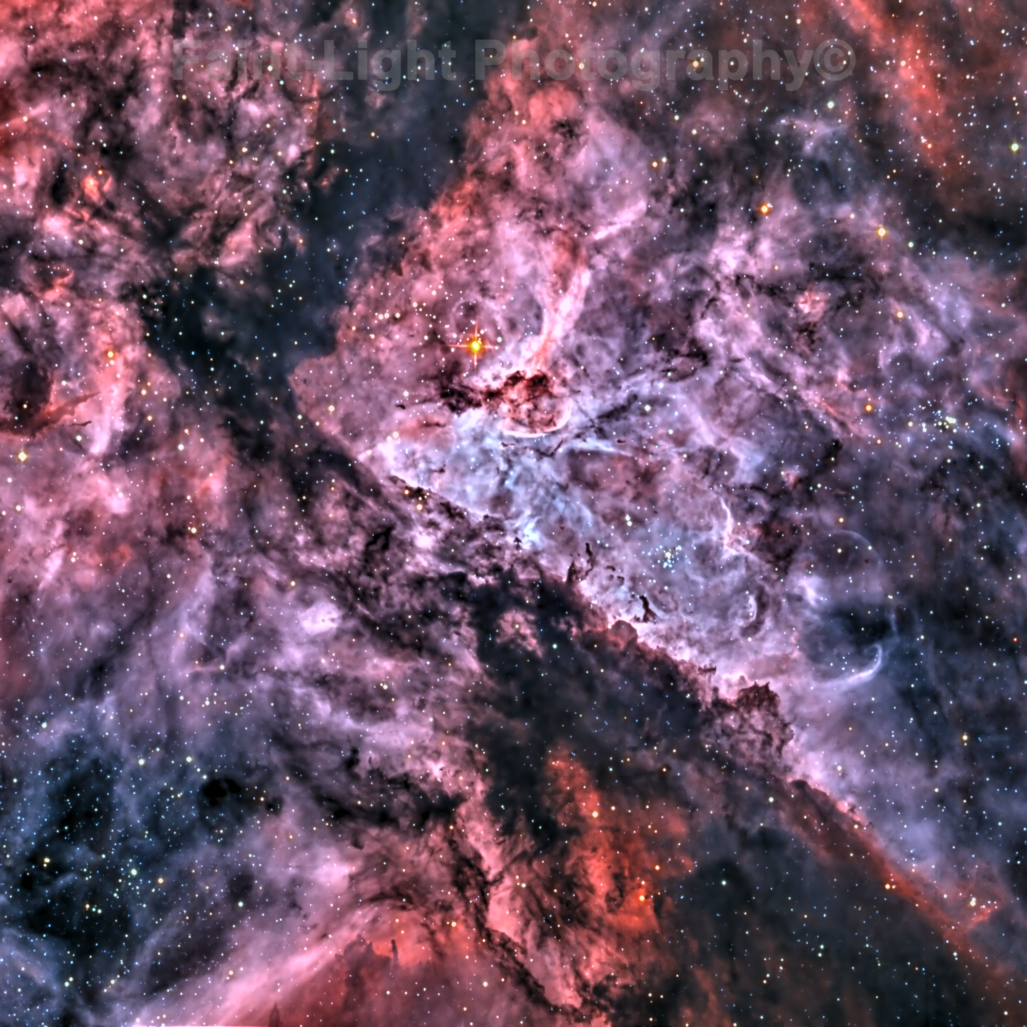 Eta Carinae Nebula is a complex of bright and dark nebulae estimated to lie at 6,500 to 10,000 light-years from earth in the Carina-Sagittarius arm of our galaxy. A very extensive, but diffuse, nebula, it hosts the brightest known star in our galaxy: WR 25 (a Wolf-Rayet star). The nebula is larger than the well-known Orion Nebula, but its greater distance makes it appear less spectacular.